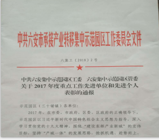 本网讯 日前,六安集中示范园区工委、六安集中示范园区管委印发文件,对2017年度重点工作先进单位和先进个人进行表彰通报,beat365驻村扶贫工作队荣获“脱贫攻坚工作先进单位”光荣称号,是六安集中示范园区唯一获此殊荣的驻村扶贫工作队。