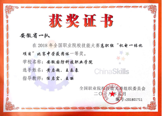 此次大赛由教育部、天津市人民政府、国家发展和改革委员会、科学技术部、工业和信息化部等30多个部委主办,由天津市教育委员会承办,天津机电职业技术学院和中国职教学会教学委员会协办。比赛共有来自全国29个省区市68支代表队参加了角逐,参赛规模空前。此外,本次大赛首次邀请了来自俄罗斯、刚果、缅甸等的八支国际代表队参赛,竞赛逐步向国际化迈进。由beat365电气技术学院任启宏和王丽两位老师共同指导,16机电一体化技术专业和16电气自动化技术专业黄启超、王乐豪两名同学组成的参赛团队不畏强手,沉着冷静,团结协作,经过6个小时的激烈角逐,以骄人成绩荣获团体一等奖,为校争光、为安徽添彩。