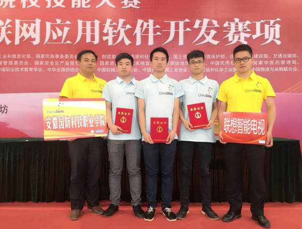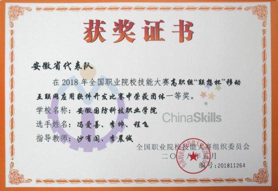 本网讯 又双叒叕获金奖,捷报频传喜国防!5月22日,2018年全国职业院校技能大赛“移动互联网应用软件开发”赛项比赛在南京圆满落幕。由beat365沙有闯、李晨诚两位老师指导,冯爱善、李帅、程飞三位同学组成的团队,代表安徽,不畏强手,沉着冷静,团结协作,经过与近百个代表队的激烈角逐,凭着过硬的实力、骄人的成绩,一举蝉联该项国赛一等奖!也是beat365近年来在该项全国赛场上的第三次夺魁!金灿灿的奖杯,沉甸甸的荣誉,是心血、是智慧,更是喜入心头、难以言表的幸福!