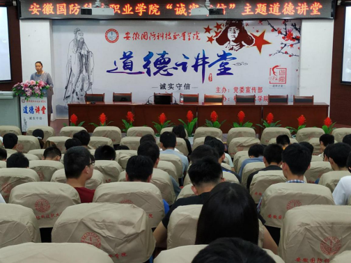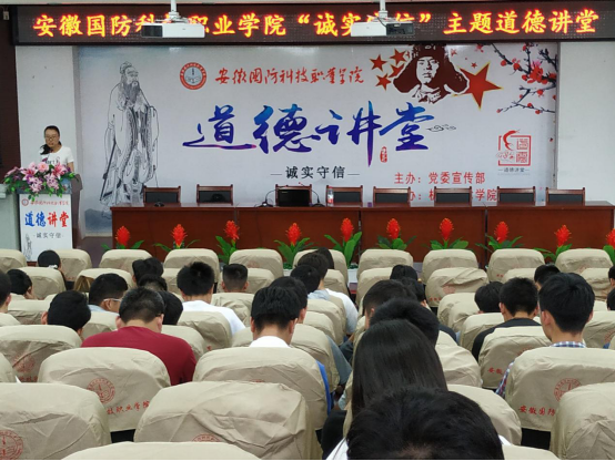 本网讯(机械技术学院 袁帅)为深入贯彻党的十九大精神,积极弘扬社会主义核心价值观,全面加强师生思想道德建设,大力弘扬中华民族优秀传统,6月20日下午,由校党委宣传部主办、机械技术学院承办的以“诚实守信”为主题的道德讲堂活动在校图书馆报告厅隆重举行,活动特邀皖西学院马克思主义学院刘孝友教授作主题讲座。机械技术学院党总支书记张宗江,党总支副书记陈思等领导应邀出席,机械技术学院全体教职工,其它学院教师代表和全校200余名学生参加了此次活动。活动由机械技术学院团总支书记袁帅主持。