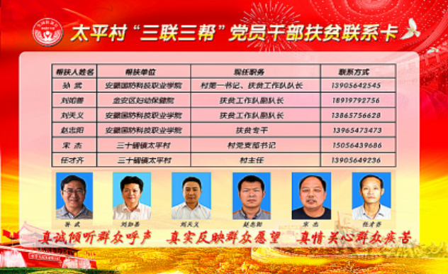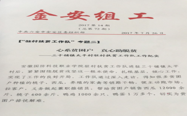 编者按:学校扶贫工作队自2017年4月进驻六安市三十铺镇太平村以来,在学校党委和当地政府的正确领导和大力支持下,扶贫工作队严格按照省委省政府决策部署,认真履行“建强基层组织、推动精准扶贫、为民办事服务、提升治理水平”职责任务,牢记使命,潜心扶贫,太平村贫困人口发生率由建档立卡时的17.4%下降到0.9%,村级集体经济实现了从无到有达到12.14万元,群众对学校扶贫测评满意度达到100%。学校扶贫工作队先后荣获六安市集中示范园区“脱贫攻坚先进单位”、六安市集中示范园区“优秀基层党组织”等光荣称号。中央人民广播电台、安徽广播电视台、六安电视台、安徽工人日报、安徽教育厅网、皖工网等主流媒体先后报道学校驻村扶贫工作。
