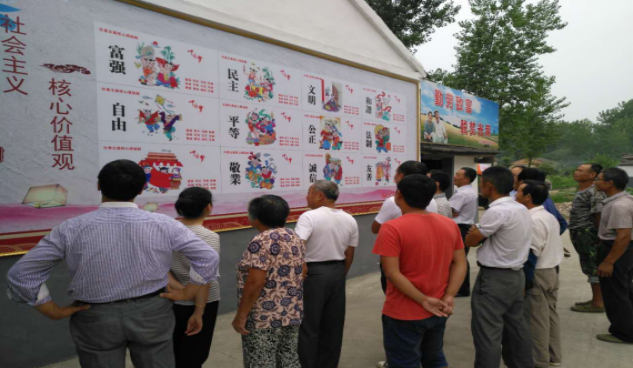 扶贫工作队定期策划制作扶贫文化墙,图为制作的社会主义核心价值观文化墙吸引广大村民驻足观看