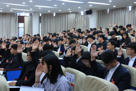 学生代表举手表决各项议案
