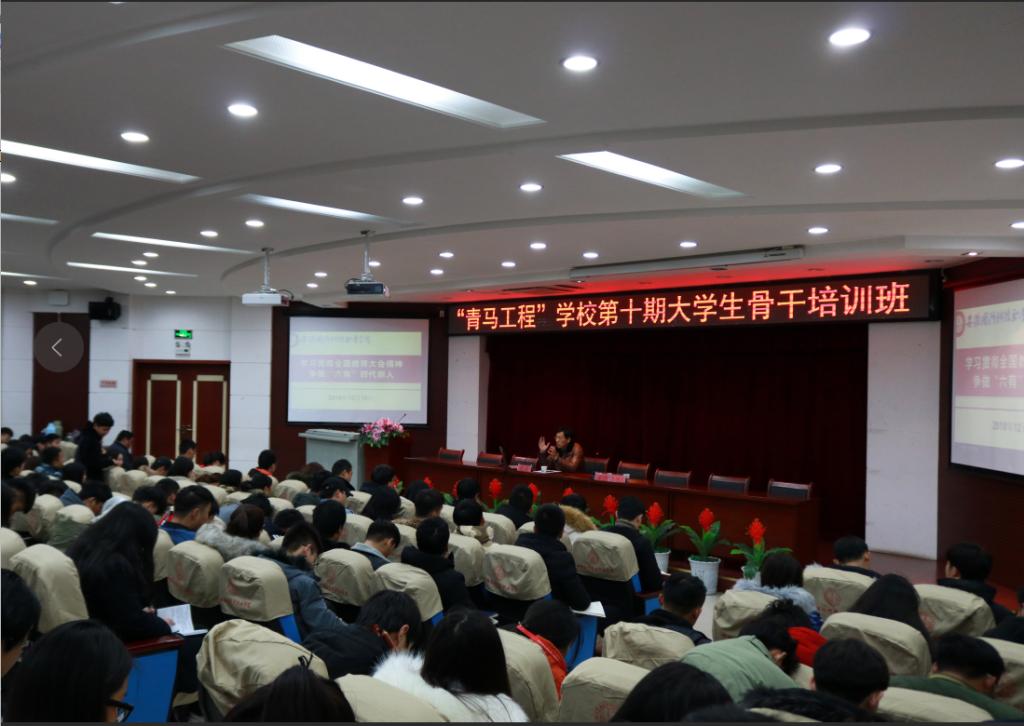 本网讯 12月10日晚,校青马工程第十期培训班结业仪式在图书馆报告厅圆满举办。校党委委员、宣传部部长、思政部主任袁旗为本期培训作了《学习贯彻全国教育大会精神,争做“六有”时代新人》的专题讲座。仪式由团委素质拓展中心主任雷雨主持。团委、各团总支相关教师及两百余名学生干部聆听了讲座。