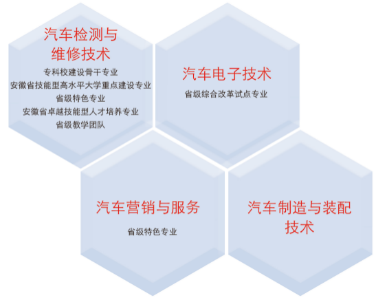 汽车技术学院:开设汽车检测与维修技术等4个专业,校企共建了5650m2的实验实训中心,中心具有省内一流的实验实训教学设施,各类设备1500台套,设备总值近1200万元,可同时容纳1000人左右实验实训教学要求,兼有15家示范基地和40余家紧密型基地。