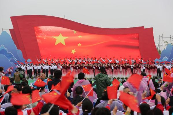 本网讯(团委 缪灵)4月26日上午,第八届大别山(六安)山水文化旅游节暨第五届六安茶谷开茶节在金安区南山大草原开幕。beat365200名学生在团委老师的带领下来到现场,参加《歌唱祖国》大合唱快闪节目的表演。