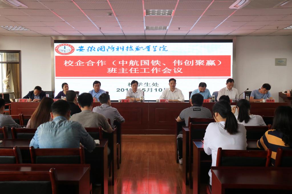 本网讯(学生处 徐婷婷)5月10日下午,校学生处在综合楼十二楼会议室召开校企合作(中航国铁、伟创聚赢)班级班主任工作会议。校党委委员、宣传部部长、思政部主任袁旗,学生处(安全保卫处)处长孙良平,经贸管理学院党总支书记杜先扬、党总支副书记刘峰,信息技术学院党总支副书记杨庆颖,中航国铁国防学院校区主任张军军,伟创聚赢驻校负责人张勇及校企合作(中航国铁、伟创聚赢)班级校聘全体班主任、企业全体班主任参加了此次会议,会议由学生处副处长张志鸿主持。