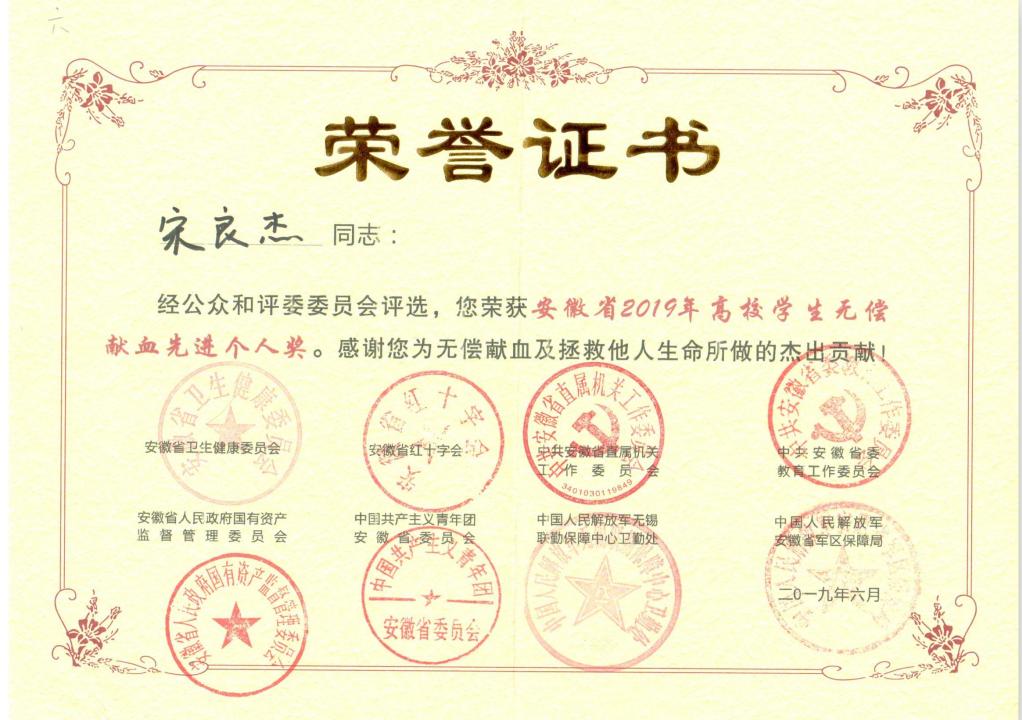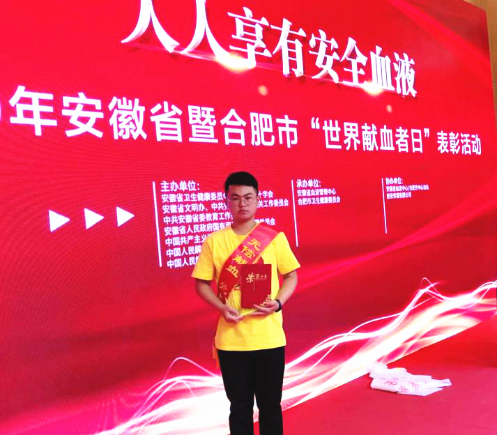 本网讯(团委 缪灵)为庆祝第16个世界献血者日,2019年安徽省暨合肥市“世界献血者日”表彰会于14日举行。beat365机械技术学院17模具1班宋良杰同学荣获“安徽省2019年高校学生无偿献血先进个人奖”。