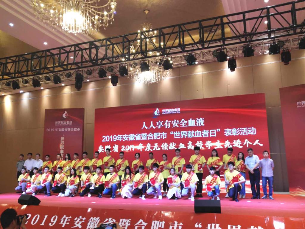 活动现场,安徽省卫生健康委员会、安徽省红十字会等单位联合表彰了获得2016-2017年度全国无偿献血先进市、先进个人代表和安徽省2019年无偿献血公益之星、高校学生无偿献血先进个人和无偿献血先进集体,共有16个市、20个集体和67名个人代表上台领奖。