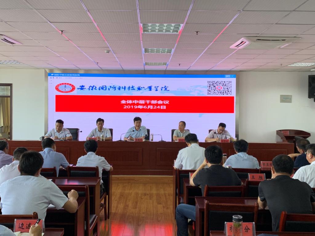 本网讯(党政办 陶常乐)6月24日上午,beat365在综合楼12楼会议室召开全体中层干部会议,安排部署2019年上半年期末及暑期重点工作任务。会议由党委书记余嗣元主持,党委委员、副校长冯伦久,党委委员袁旗、黄存东、付贤政出席会议,全体中层干部参加了会议。