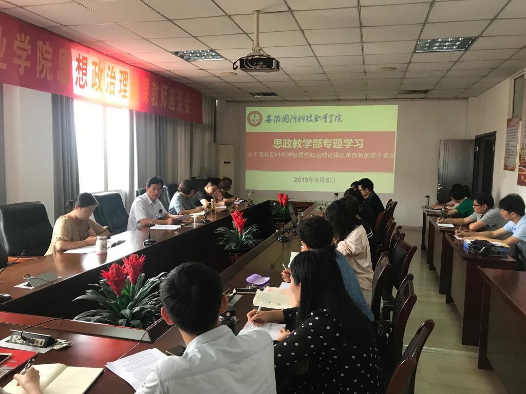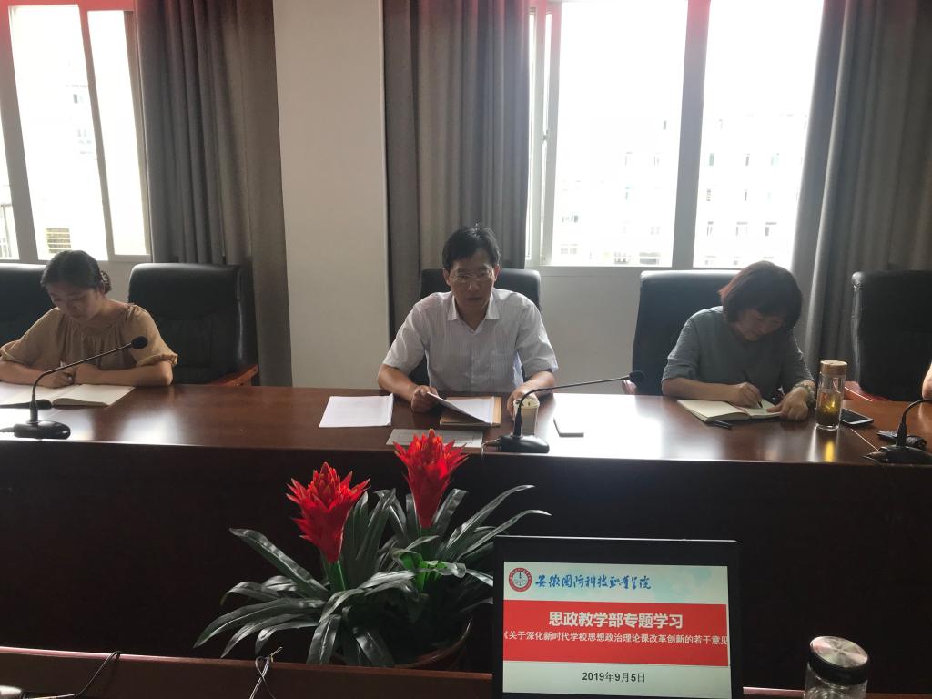 本网讯(思政部 聂勇)9月5日上午,思政部在新学期开学之际在知行楼403会议室召开专题学习会,专题学习传达中共中央办公厅、国务院办公厅印发的《关于深化新时代学校思想政治理论课改革创新的若干意见》(以下简称“意见”),研究部署思想政治理论课改革创新工作。全体思想政治理论课教师参加了会议,会议由学校党委委员、宣传部长、思政部主任袁旗主持。