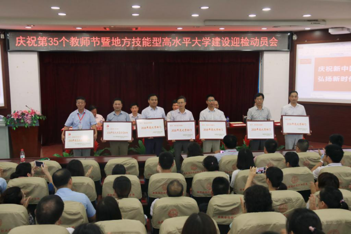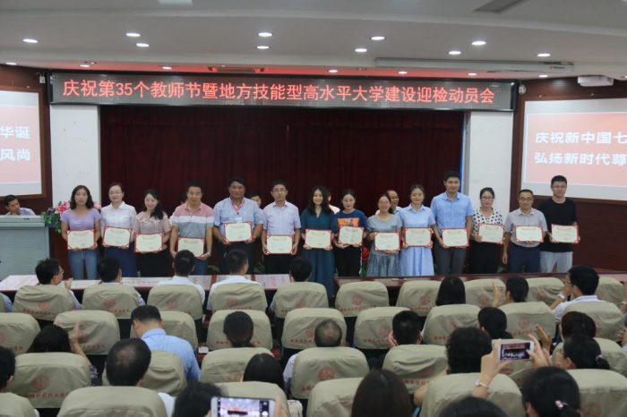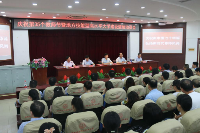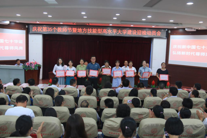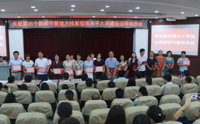 本网讯 庆祝新中国七十华诞,弘扬新时代尊师风尚。在举国上下喜迎新中国70周年华诞之际,我们迎来了第35个教师节。9月7日下午,beat365在图书馆报告厅隆重召开庆祝第35个教师节表彰暨地方技能型高水平大学建设迎检动员会,校领导余嗣元、李麟书、朱德明、冯伦久、丁守宝出席大会。会议由校党委委员、副校长丁守宝主持,全体教职工参加了表彰大会。