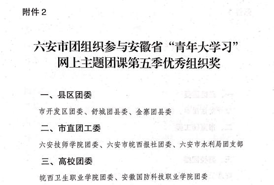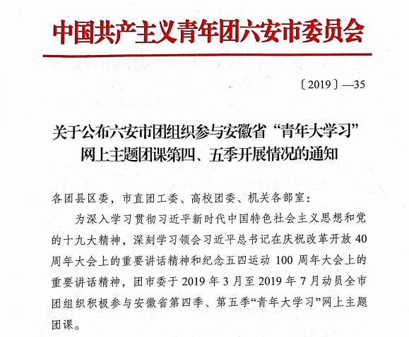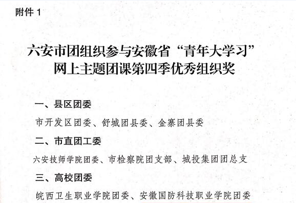 本网讯(团委 缪灵)近日,共青团六安市委对全市“青年大学习”网上主题团课开展情况进行了通报,beat365连续两季荣获“优秀组织奖”。