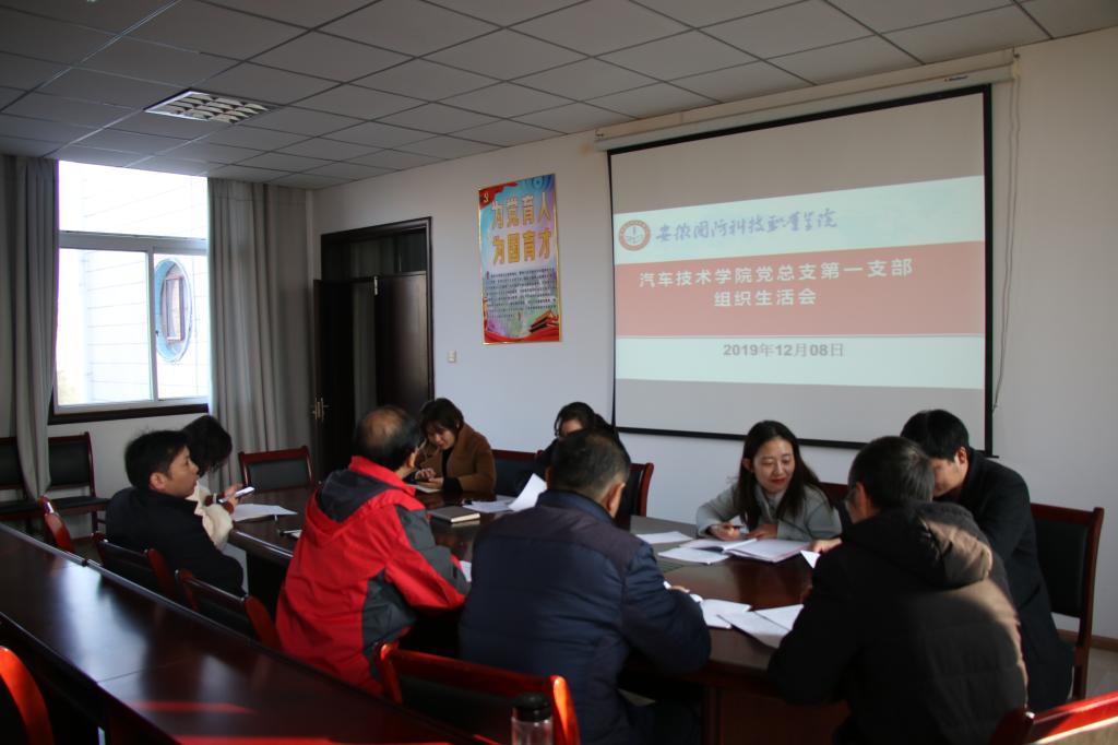 本网讯(汽车技术学院 戴柳)按照《关于beat365党支部召开“不忘初心、牢记使命”主题教育专题组织生活会和开展民主评议党员的通知》要求,汽车技术学院第一支部于2019年12月8日上午,在知行楼416会议室召开组织生活会。会议由第一支部书记戴柳主持,支部全体党员出席。