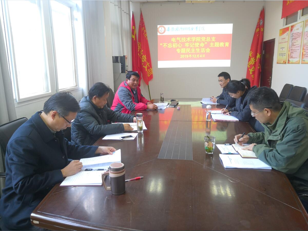 本网讯(电气技术学院 史媛芳)根据《中共beat365在线唯一官网委员会“不忘初心、牢记使命”主题教育专题民主生活会工作方案》文件精神,及《电气技术学院“不忘初心、牢记使命”主题教育专题民主生活会工作方案》安排和部署,12月4日下午,电气技术学院党总支组织召开了“不忘初心、牢记使命”主题教育专题民主生活会,会议由党总支书记王希江主持,电气学院党总支班子成员参加了会议,校党委委员、副校长丁守宝到会指导。