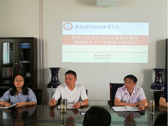 本网讯 为了确保学院重点工作顺利推进,加强党建和领导作风建设,城市建设学院于6月3日于学院会议室召开了党总支民主生活会征集群众意见暨2020上半年教职工座谈会,会议由院长张显国主持,全院教职工参加座谈会议。