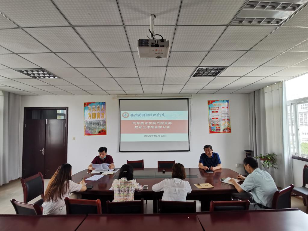 本网讯(汽车技术学院 戴柳)6月3日下午3:00,汽车技术学院汽车制造支部、汽车检测支部在知行楼410办公室、知行楼416会议室召开2020年政府工作报告学习会。会议由黄道业、姜继文主持,全体党员老师参加。