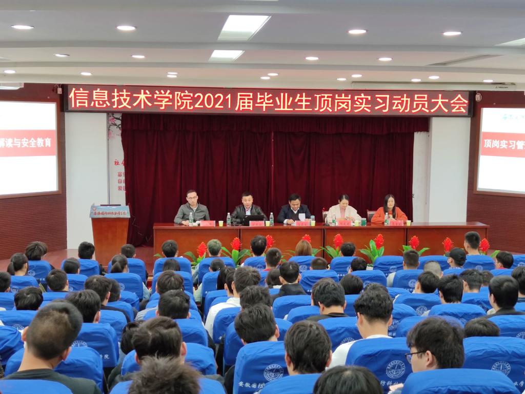 本网讯(信息技术学院 马士君)11月3日下午,信息技术学院在图书馆报告厅召开了2021届毕业生顶岗实习动员大会暨文明离校安全教育大会。学院院长黄存东、副院长沙有闯、党总支副书记杨庆颖、顶岗实习指导老师、辅导员、班主任和全体2021届毕业生参加了此次大会,大会由沙有闯主持。