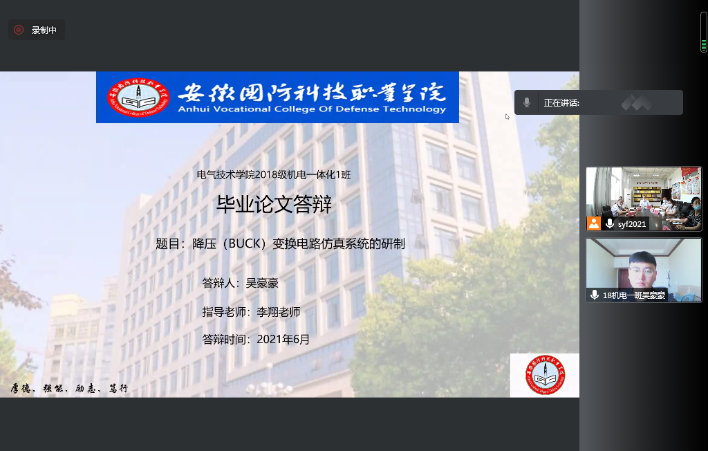 本网讯(电气技术学院 任汉鼎) 6月5日,电气技术学院开展了2021届部分毕业生毕业设计线上答辩工作。参加本次线上答辩的共有23名专升本学生,15位专家教师以及3位答辩秘书。答辩人员分为3个小组,通过腾讯会议平台完成了线上毕业论文答辩工作。