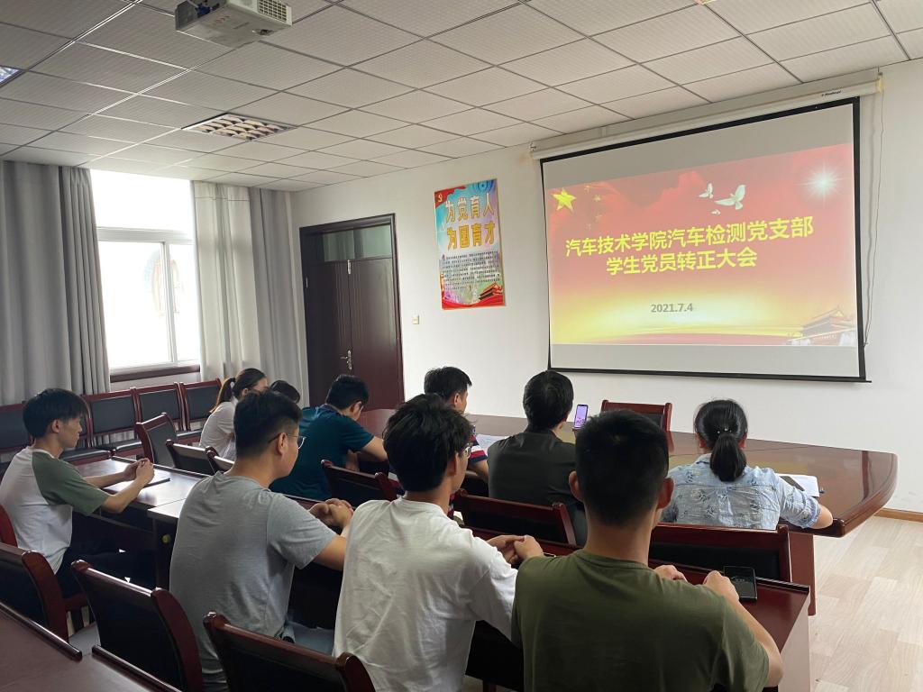 本网讯(汽车技术学院 戴柳)为切实保障党员的民主权利,使党员在本支部发展党员工作过程中充分表达个人意愿,提高新党员的群众公认程度,确保新党员质量,2021年7月4日下午3:00,汽车技术学院汽车检测党支部在知行楼416会议室召开预备党员转正大会。会议由支部书记姜继文主持,全体职工党员和在校预备党员参加,校外拟转正的预备党员线上参加转正大会。