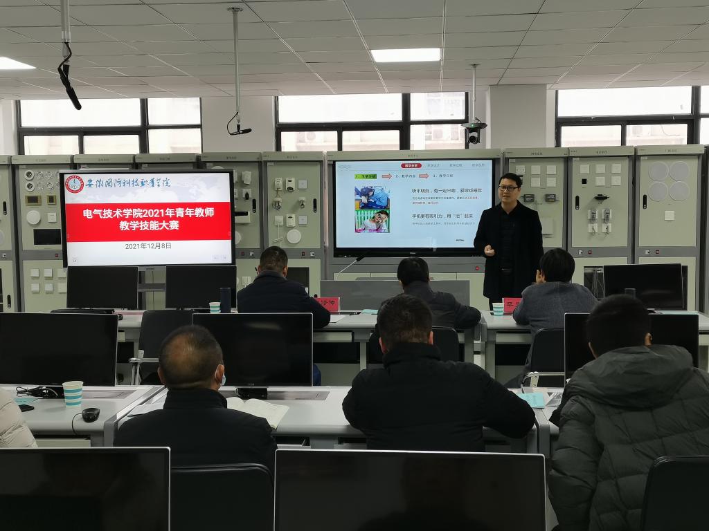 本网讯(电气技术学院 程坤)为进一步提升学院青年教师教学能力和水平,促进教师专业发展,提高教师综合素质,加强青年教师队伍建设,根据《关于举办电气技术学院2021年青年教师教学技能大赛的通知》(校电气学院〔2021〕33号)文件安排,2021年12月8日下午,电气技术学院在秉心楼402实验室举办了2021年青年教师教学技能大赛,严正红等6位青年教师参加了比赛。本次比赛邀请汽车技术学院院长黄道业教授、校高建办主任朱修传教授、机械技术学院毕亚东副教授担任评委,电气技术学院全体专业教师现场观摩。