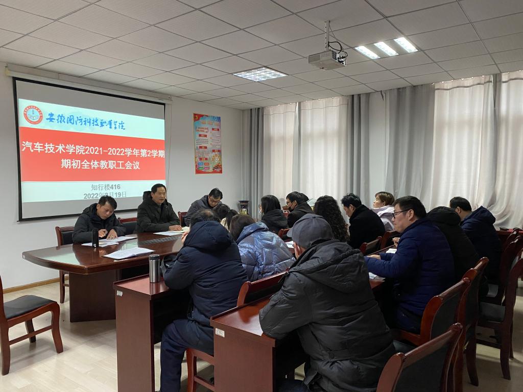 本网讯(汽车技术学院 任培培)为了贯彻落实学校有关会议精神,使全体教职工凝心聚力、提振精神,全力投入新学期工作,2月19日下午,汽车技术学院组织召开全体教职工会议,部署安排新学期重点工作。会议由党总支书记、院长孙良平主持,全体教职工参加会议。