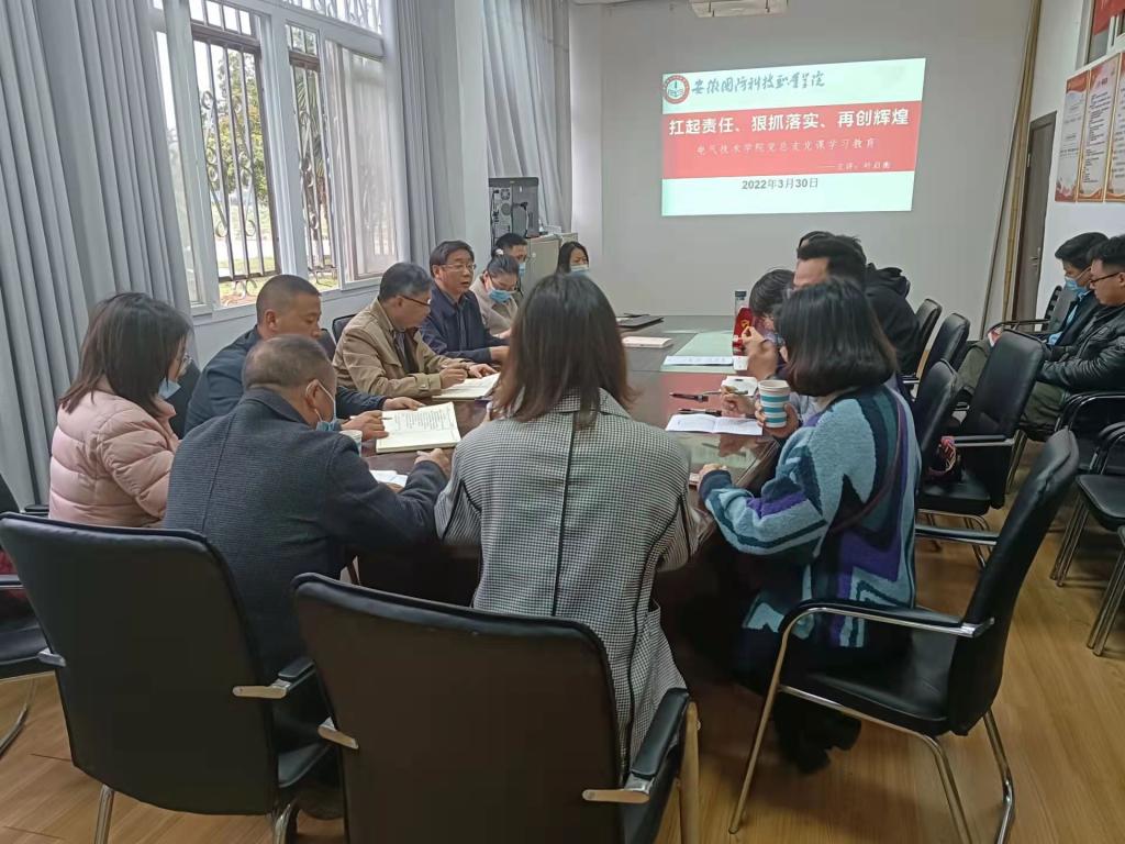 本网讯(电气技术学院 程坤)为进一步学习贯彻党的十九届六中全会精神,落实全面从严治党要求,加强和改进作风建设,3月30日下午,电气技术学院党总支书记叶启衡在学院会议室组织召开一堂“扛起责任、狠抓落实、再创辉煌”专题党课,电气技术学院全体党员一起聆听了党课。