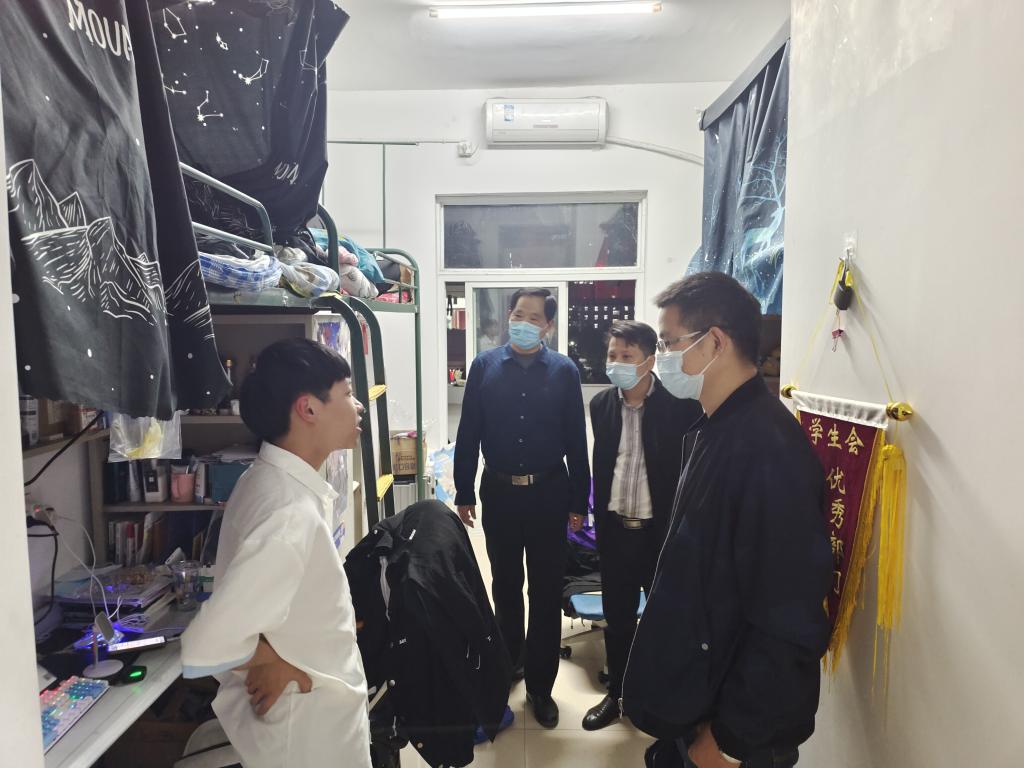 在宿舍里,学院领导与同学们亲切交谈,询问大家封闭管理期间的线上学习情况和生活情况,并叮嘱同学们要注意保持良好的宿舍卫生,定期消毒通风,严格执行晨午晚体温检测制度,树立宿舍安全意识,严格遵守学校宿舍管理制度,积极参加学校和学院防诈骗教育活动,增强防诈骗意识。孙书记在走访时强调,同学们要严格遵守疫情防控期间校园管理要求、做好疫情防控常态化下的自我管理和个人防护,养成良好的生活卫生习惯,注意身体健康,保持积极的心理状态,共同营造安全有序的校园环境。同学们在线上学习和校园生活中遇到困难或者问题,可以及时跟辅导员或班主任老师联系。