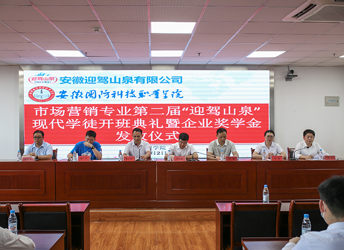 本网讯(经贸管理学院 光辰宸)6月2日,beat365与安徽迎驾山泉股份有限公司共建的市场营销专业第二届“迎驾山泉”现代学徒班在校秉心楼12楼会议室隆重举行。校党委委员、办公室主任李存鹏,经贸管理学院党总支书记刘峰、院长杨力、副院长杨学分,安徽迎驾山泉股份有限公司营销总监鲁正贤、人力资源处处长张磊、公司六安大区经理陈广宇、校市场营销专业相关骨干教师及20级、21级“迎驾山泉”营销班全体学徒出席开班典礼,典礼由杨力主持。