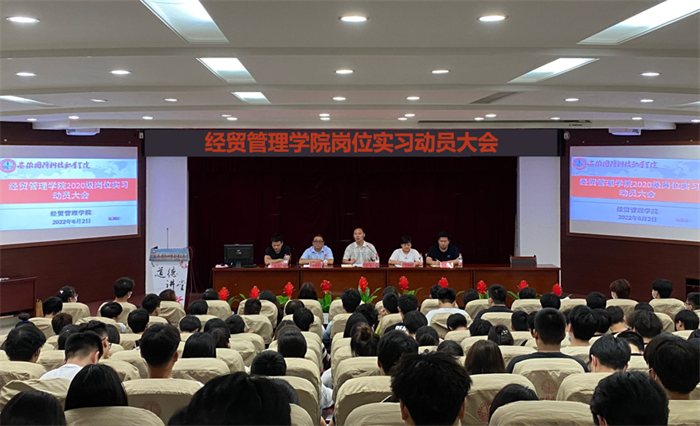 本网讯(经贸管理学院 聂垚)为贯彻落实学校相关文件精神和要求,全力做好经贸管理学院2020级学生岗位实习工作,6月2日晚上,经贸管理学院在图书馆报告厅组织召开2020级相关专业学生岗位实习动员大会。学院党总支书记刘峰,学院副院长杨学分,学院团总支书记许凤麟,辅导员陈玮、聂垚以及各班主任和学生参加了此次大会。大会由团总支书记许凤麟主持。