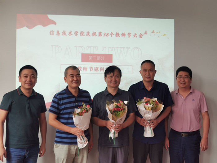本网讯(信息技术学院 马士君)春风化雨润桃李,青丝白头画春秋。9月9日下午,在第38个教师节来临之际,信息技术学院在知行楼304会议室组织召开了以“迎接党的二十大,培根铸魂育新人”为主题的教师节大会。校党委委员、信息技术学院院长沙有闯,党总支书记王胜,副书记杨庆颖,副院长雷惊鹏出席大会,全体教职工参加会议。会议由王胜主持。