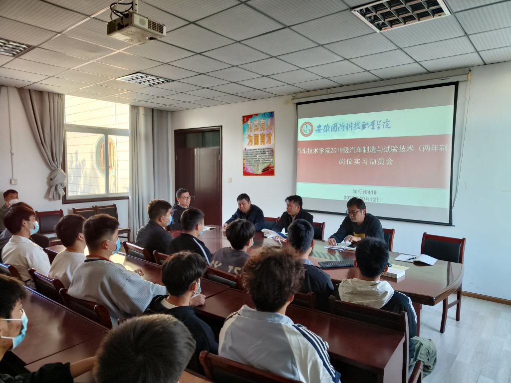 本网讯(汽车技术学院 黄世超)为贯彻落实学校相关文件精神和要求,全力做好2018级汽车制造与试验技术专业(两年制)学生岗位实习工作,10月12日下午,汽车技术学院在知行楼416会议室举行2018级汽车制造与试验技术专业(两年制)学生岗位实习动员会。汽车技术学院党总支副书记余桂刚、副院长姜继文、就业辅导员黄世超及实习指导教师参加了本次会议。