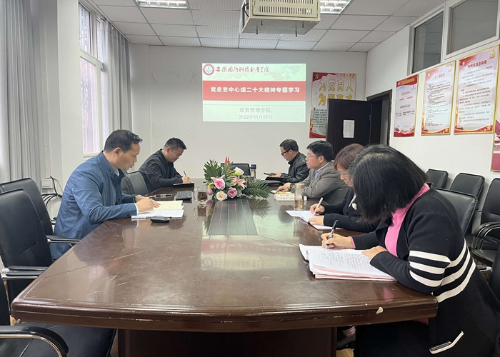 本网讯(经贸管理学院 付玉梅)11月7日,经贸管理学院党总支召开中心组会议,专题学习党的二十大精神,院党总支书记刘峰领学,总支委员杨力、杨学分、张圣霞参加会议,院办公室主任付玉梅、团总支副书记陈玮列席。
