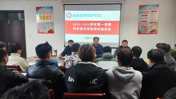 本网讯(汽车技术学院 徐婷婷)为进一步提升学生管理、教学管理水平,把握学生思想动态,密切师生情感,12月2日下午在知行楼416会议室召开汽车学院2022-2023学年第一学期师生座谈会,学院党总支书记、院长孙良平,辅导员黄世超、徐婷婷以及在校班级学生代表参加会议,会议由学院副院长姜继文主持。