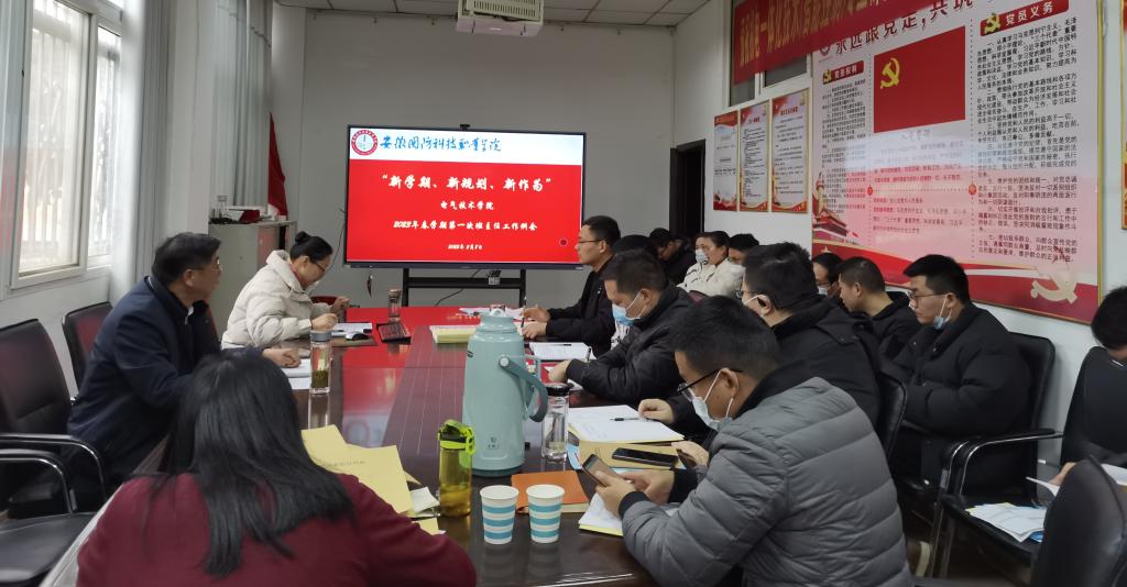 本网讯(电气技术学院 王星星)为了保障春季学期开学安全、平稳、有序,电气技术学院于2月8日在知行楼102会议室召开“新学期、新规划、新作为”2023年春学期第一次班主任工作例会。电气技术学院党总支书记叶启衡、党总支副书记张丽、全体辅导员及班主任参加此次会议,会议由张丽主持。