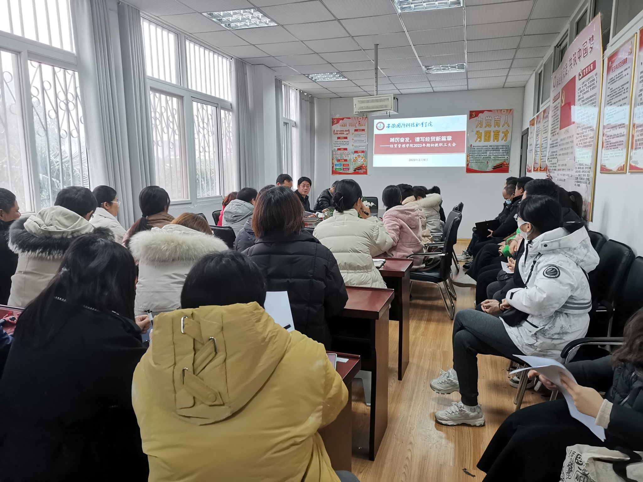 本网讯(经贸管理学院 付玉梅)为了进一步统一思想、凝心聚力,推动新学期学院各项工作有序高效开展,2月9日下午,经贸管理学院组织召开新学期期初教职工大会。学院全体教职工参会,会议由院长杨力主持。
