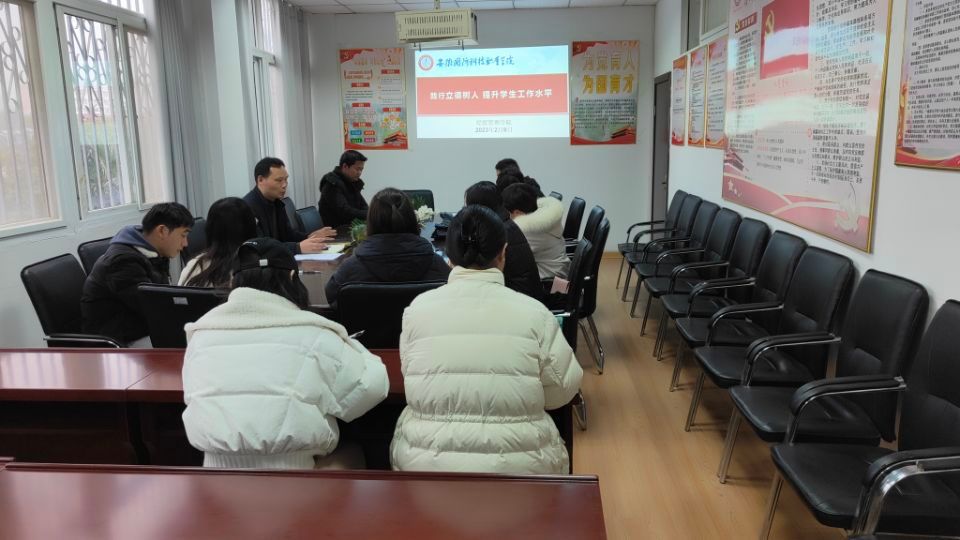 本网讯(经贸管理学院 聂垚)2月9日,新学期学生开学之际,为进一步贯彻落实学校“一改两为”全面提升工作效能暨“双高”创建大会精神,经贸管理学院召开2023年春季学期第一次学生工作会议,全体辅导员、班主任参加会议,会议由院党总支书记刘峰主持。