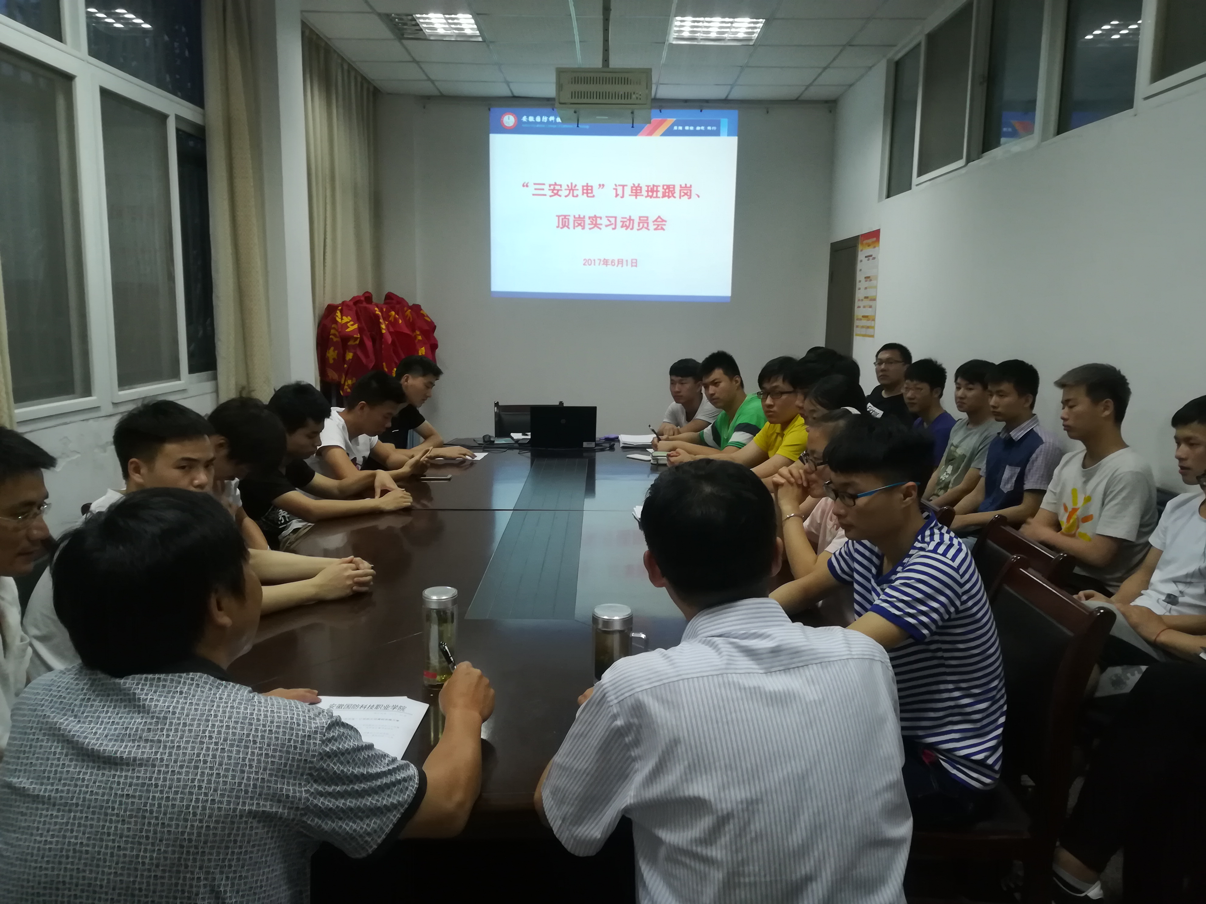 为推进高水平大学重点专业机电一体化专业人才培养模式改革,切实做好“三安光电”班跟岗、顶岗实习工作,提高订单班学生对跟岗、顶岗实习的目的和意义的认识,引导学生做好跟岗、顶岗实习准备,6月1日晚,机电工程系在系会议室召开2015级“三安光电”订单班学生跟岗、顶岗实习动员培训会。系党总支书记陈兆同、副主任李翔、党总支副书记罗威、订单班班主任杨志清及2015级“三安光电”订单班全体学生出席了此次大会,会议由陈兆同主持。