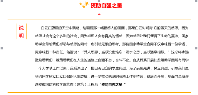 管理(建筑)工程系自贫困助学工作开展以来,在学生工作处、学生资助管理中心指导下,我系开展2017年度 “自强之星”评选活动,评选出一批激流勇进、顽强拼搏、自强不息的优秀学生。此次活动充分展示和塑造了当代大学生自强自立、拼搏进取的感人事迹,为青年大学生树立了自强、自立的榜样,在全系营造了关心、支持大学生自立自强、健康成才的良好氛围。