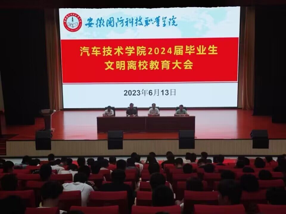 本网讯(汽车技术学院 黄世超) 为贯彻落实学校关于毕业生工作的有关要求,加强毕业生离校管理,帮助解答学生毕业离校过程中的疑惑,促进毕业生爱校荣校,推动2024届毕业生离校工作安全、文明、有序开展,6月13日,汽车技术学院在产教融合中心报告厅隆重举行汽车技术学院2024届毕业生文明离校教育大会。汽车技术学院党总支书记、院长孙良平、党总支副书记余桂刚、副院长姜继文、2024届毕业班班主任参加了本次会议。