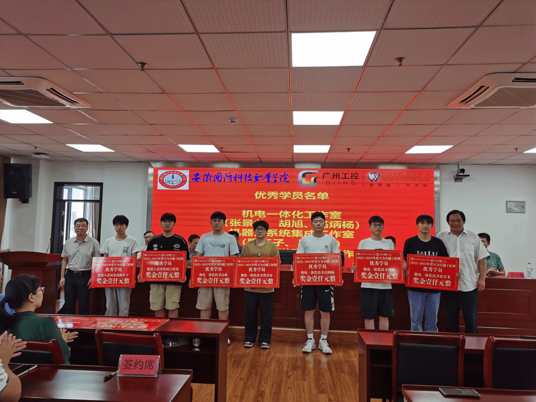 本网讯(电气技术学院 吴年祥)为进一步推进卓越工匠人才的培养,弘扬“锐意进取,精益求精,工作严谨、爱岗敬业”的工匠精神,6月26日,电气技术学院组织开展“万力”卓越工匠班年度考核表彰大会。合肥万力轮胎有限公司党总支副书记、工会主席邓京,副总工程师刘世显,人力资源部部长程婧娴,校党委委员、副校长李存鹏,校党委委员、工会主席、质量管理办公室主任黄存东、校企合作办公室主任李中永,电气技术学院院长李翔等校企双方领导,以及学院教师和工匠班指导老师和全体学员参加,会议由电气技术学院副院长江治国主持。