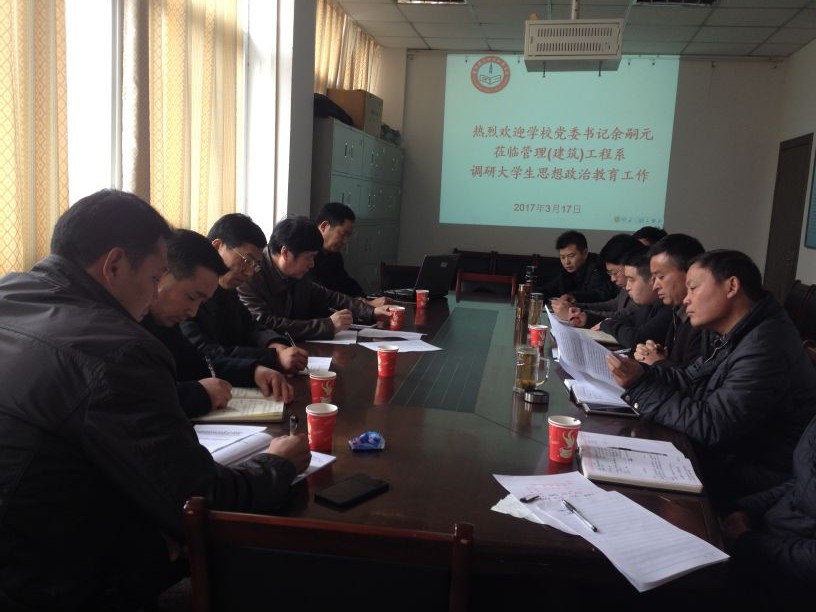 系书记杜先扬、系主任张显国、校企合作专业的项目负责人向余嗣元一行汇报了系大学生思想政治教育工作的开展情况。杜先扬从管理(建筑)工程系大学生思想政治教育工作的基本情况、大学生思想政治教育工作机制运行情况、群团组织在大学生思想政治教育中作用发挥情况、对校企合作班落实学校管理制度方面的监督管理情况、大学生思想政治教育工作中存在的实际困难等五个方面进行了详细汇报。张显国就如何形成党政齐抓共管思想政治教育工作、如何发挥团学组织在学生思想政治工作中的作用、思想政治工作队伍建设以及校企共建学院的监管等方面提出了自己的看法。