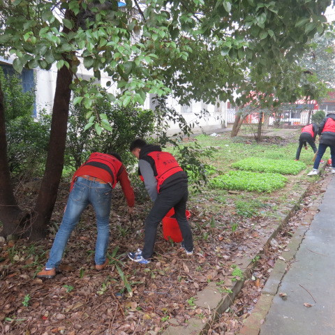 活动分为校内校外两个组,校内组负责对校内草坪、田径场进行清扫,校外组到江淮社区进行清理活动。