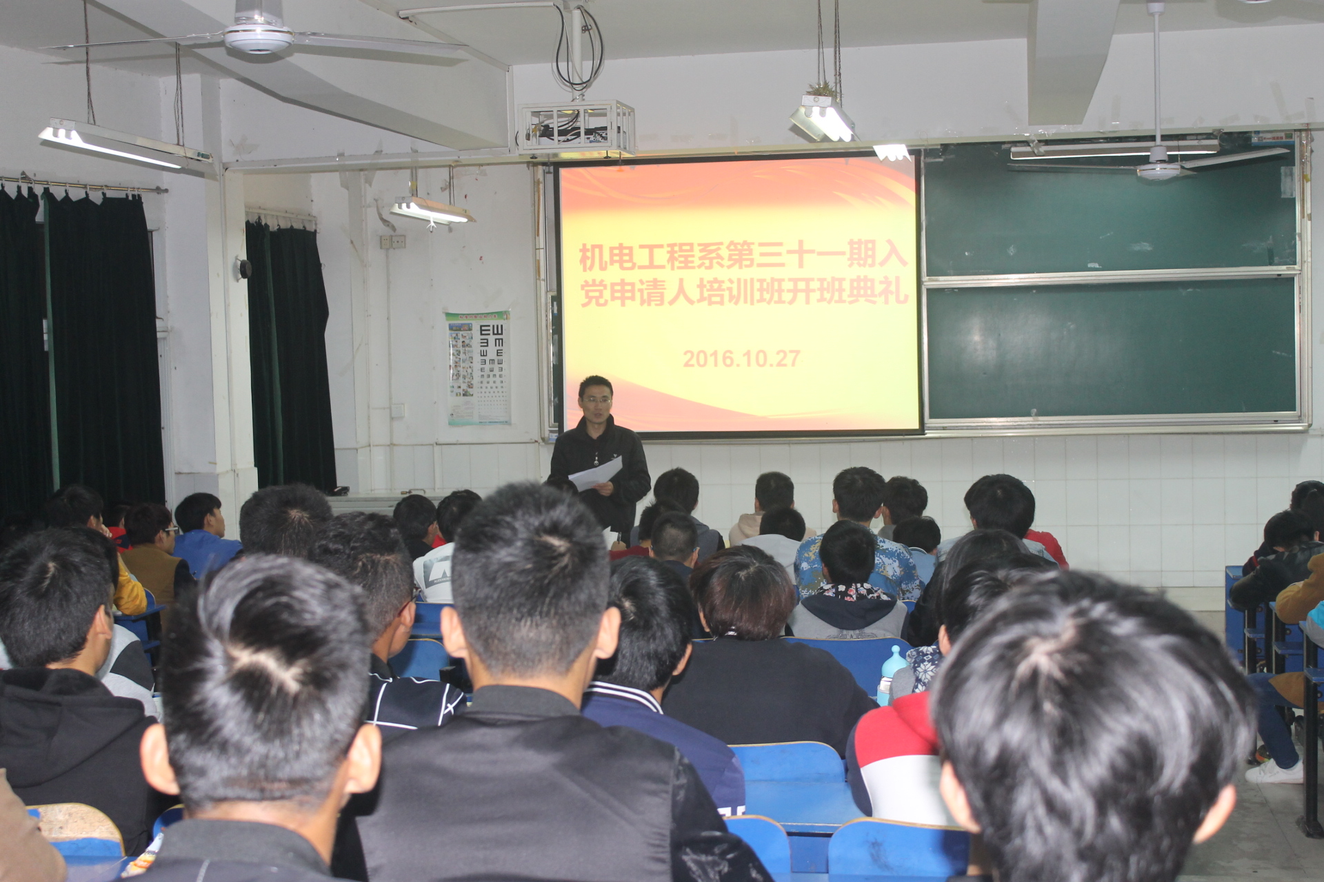 为了提高入党申请人的思想认识和理论水平,根据学院《关于举办第三十一期入党申请人培训班的通知》的文件精神,10月27日晚,机电工程系党总支在二教105教室举行第三十一期入党申请人培训班开班典礼。机电工程系党总支副书记罗威出席大会。会议由培训班班主任侯超众主持,全系79名培训班学员参加了典礼。