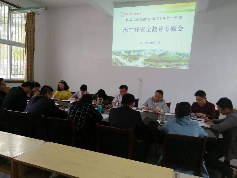 安全重于泰山,安全工作只有起点,没有终点。为进一步加强学生安全工作,机械工程系于10月9日下午在系会议室召开2016-2017学年第一学期安全教育专题工作会议,系党总支书记吴方庭出席会议并讲话,全体班主任和辅导员参加会议,会议由系党总支副书记陈思主持。