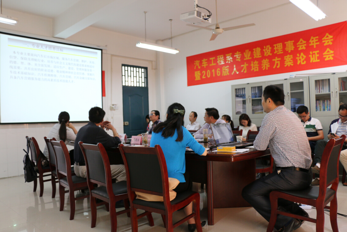 5月17日下午,汽车工程系在二号教学楼413会议室召开了专业建设理事会年会暨2016级人才培养方案论证会。合肥长安汽车有限公司人力资源经理胡永昶、六安宝源汽车销售有限公司总经理颜顺泉、六安之道汽车销售服务有限公司总经理戈义新及全系教师参加了本次会议,会议由系主任黄道业教授主持。