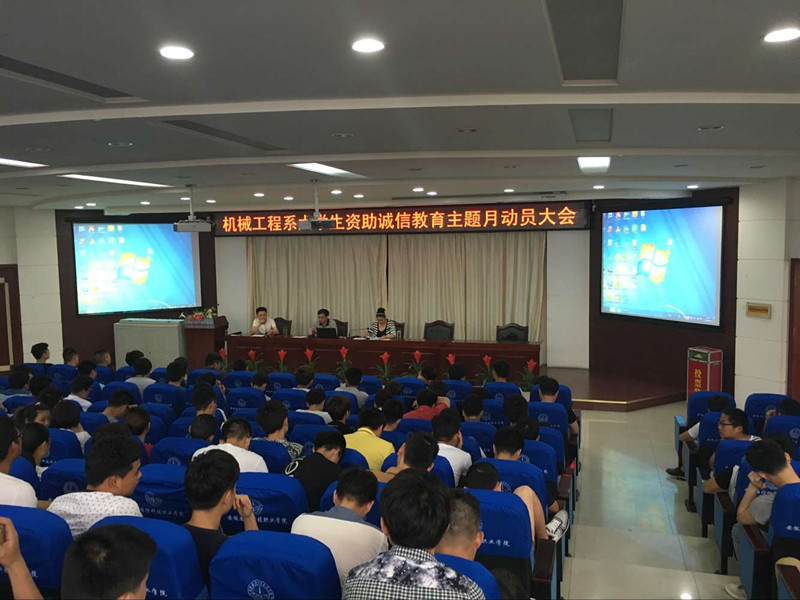 为进一步推进学生资助诚信教育工作,落实学院《关于开展2016年学生资助诚信教育主题月活动的通知》文件精神,积极构建“以诚信为荣”的校园资助文化氛围,引导家庭经济困难学生树立远大梦想,5月9日晚,机械工程系在图书馆报告厅召开 “大学生资助诚信教育主题月”活动动员会。机械工程系党总支书记吴方庭,副书记陈思出席会议。会议由负责学生资助工作的辅导员李从东主持