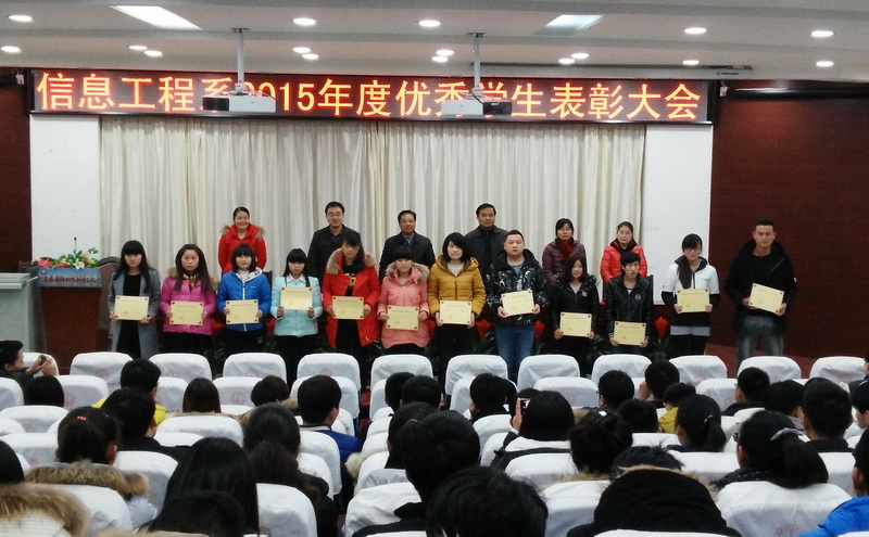 1月8日下午,信息工程系在图书馆报告厅召开2015年度优秀学生表彰大会。信息工程系党总支书记梁继会、系主任黄存东、党总支副书记杨旄袤、年级辅导员周立卓、郭艺丹出席了此次大会。大会由系团总支书记杨庆颖主持,