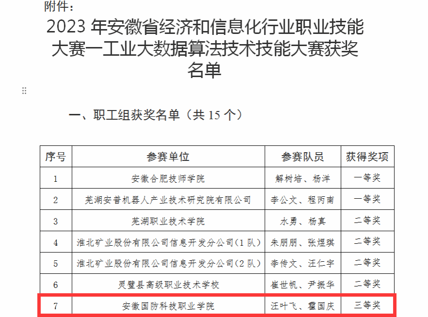 本网讯(信息技术学院 汪叶飞)2023年10月20日,安徽省经济和信息化职业技能大赛——工业大数据算法技术技能大赛在合肥闭幕,beat365汪叶飞、霍国庆两位教师凭借出色的表现荣获大赛三等奖。