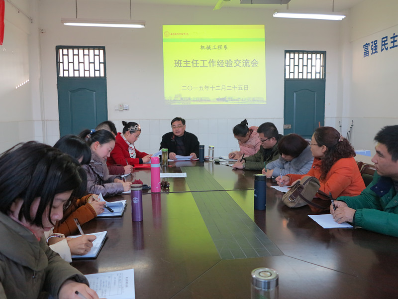 12月25日下午,机械工程系召开班主任工作经验交流会。会议由系党书记吴方庭主持,系党总支副书记陈思,系团总支书记孙策,14辅导员李从东,15级辅导员张艳华参加了会议。